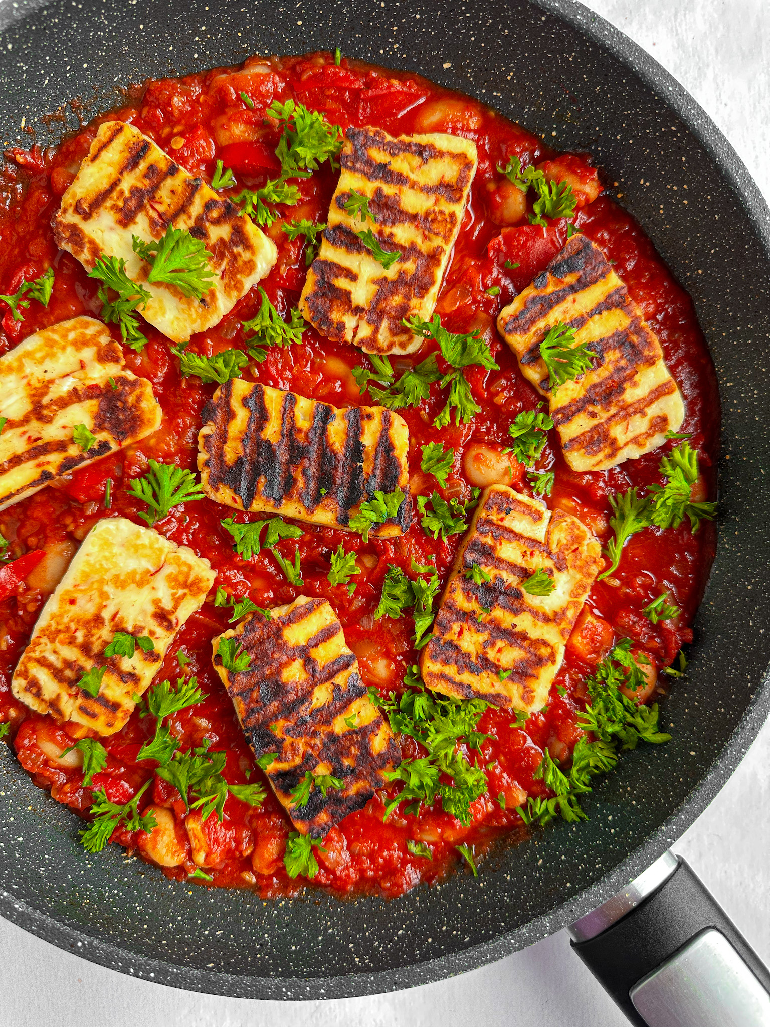 And as my die-hard fans know, my husband just loves meat too much. So, when I do decide to make something vegetarian, it better taste darn amazing. And that’s exactly what this Been and halloumi stew is. Packed with flavor and so delicious that even the biggest meat lovers will want it on repeat. And if not, swap the halloumi for chorizo – this recipe works wonders with that too.