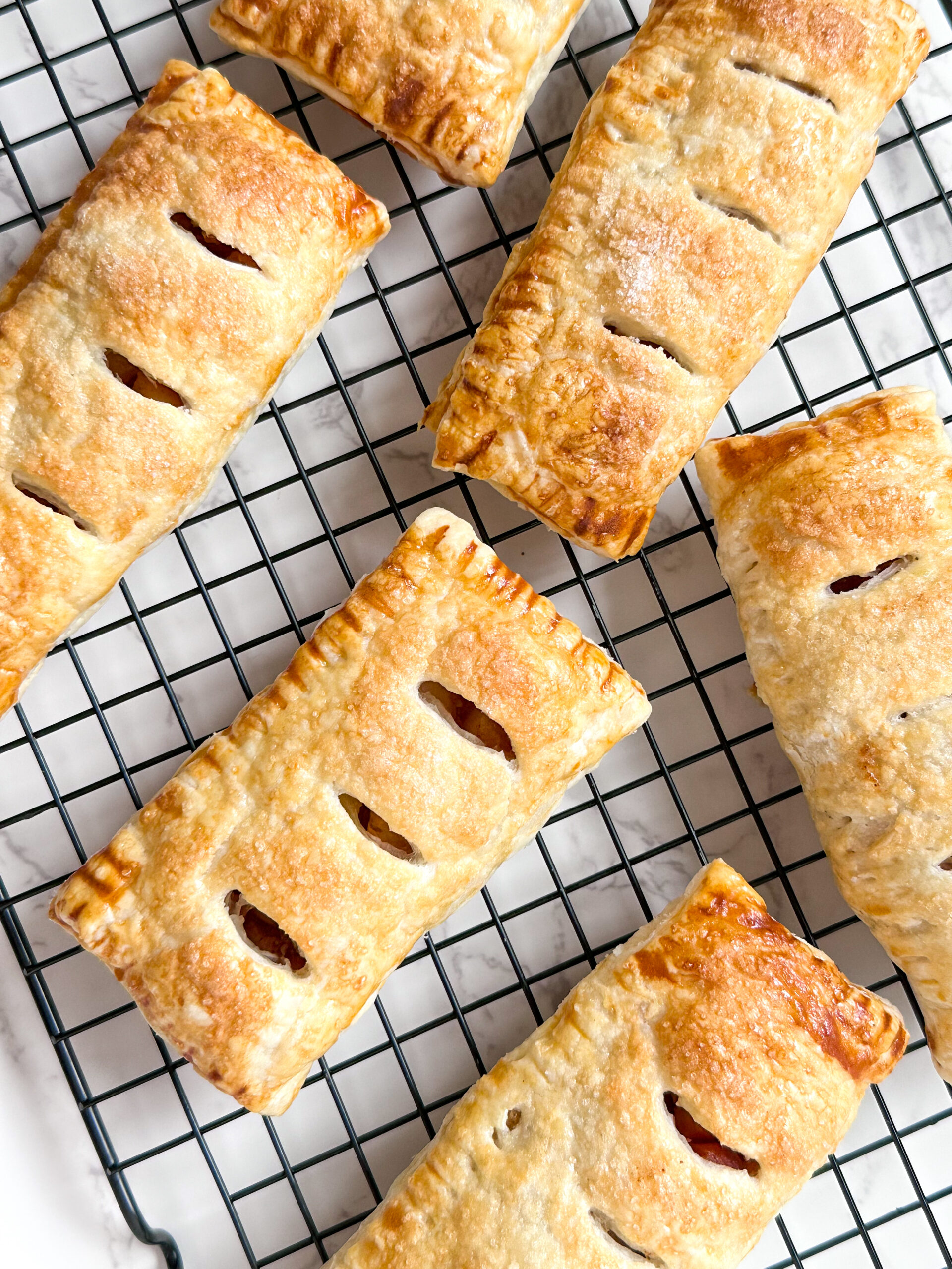 While your filling is cooling, spread the puff pastry on a baking sheet lined with baking paper and divide it into 10 identical rectangles. Brush the edges of each rectangle with egg wash and spread the apple filling on half of each. Fold each pie over and press the edges with a fork.