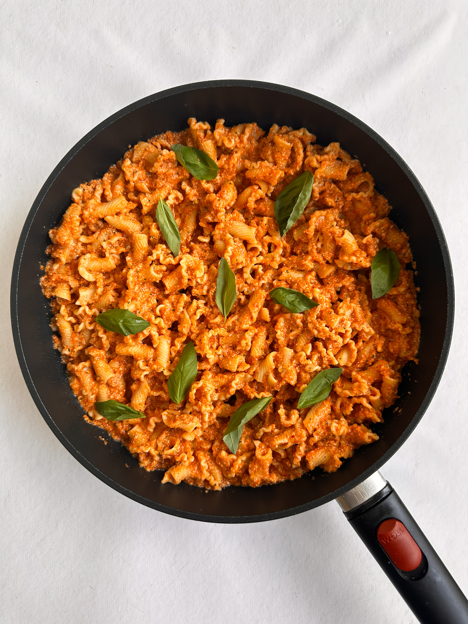 This high-protein Creamy Tomato Cottage Cheese Pasta requires only few of your pantry staples and is ready in less than 20 minutes! I love using classic penne for this recipe, but any pasta shape works great. And the sauce? This is absolutely perfect if you’re craving some comfort food but want something lighter and healthier. Thanks to the cottage cheese, the sauce is rich, creamy, yet healthy and full of protein.