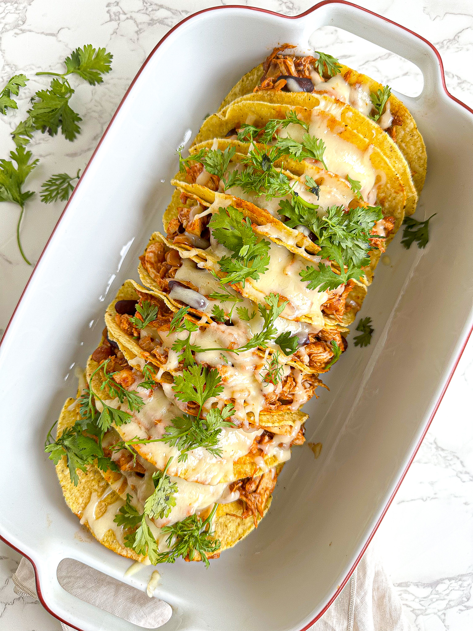 Delicious and super easy Baked Chicken Tacos include crunchy tortilla shells filled with a amazing meat and bean filling. They are packed full of flavor and are ready in under 30 minutes. So spice up your dinner plans and make these on your next Taco Tuesday! They are also great for feeding a large group, as you can prepare them in a pan several hours in advance and bake them just before eating.