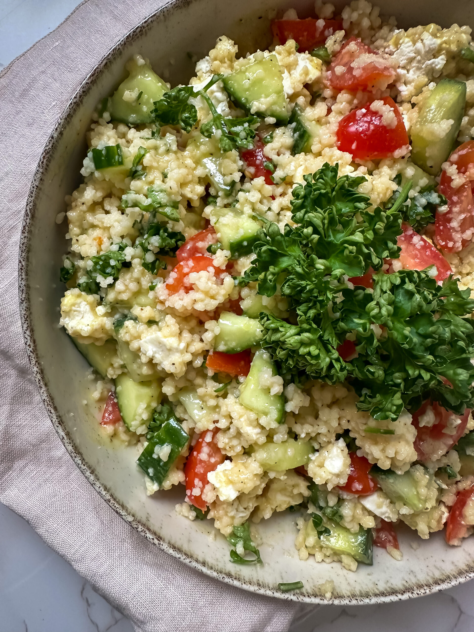 Meanwhile, prepare all the remaining ingredients (except feta) in a salad bowl. Cut the tomatoes in half, dice the cucumber, finely chop the red onion and slice the olives. After about 10 minutes the couscous should be ready. Gently fluff it with a fork and add to the chopped vegetables. Mix well.