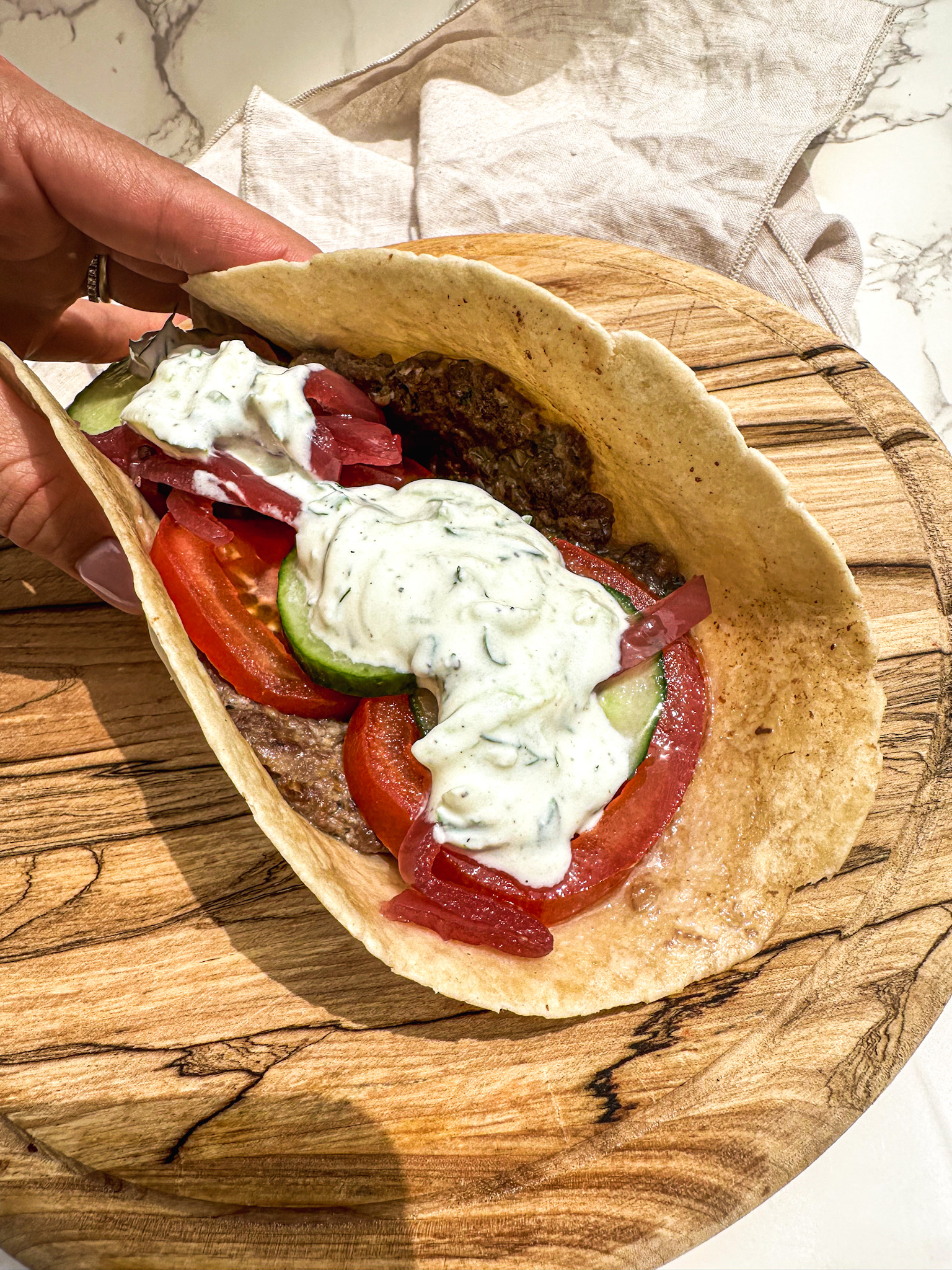 Layer fresh tomatoes and cucumber slices atop the patty. Generously dollop the prepared Tzatziki sauce on top. Now, fold your tortilla to secure the filling, and relish your delicious Gyro Smashed Burger Taco!