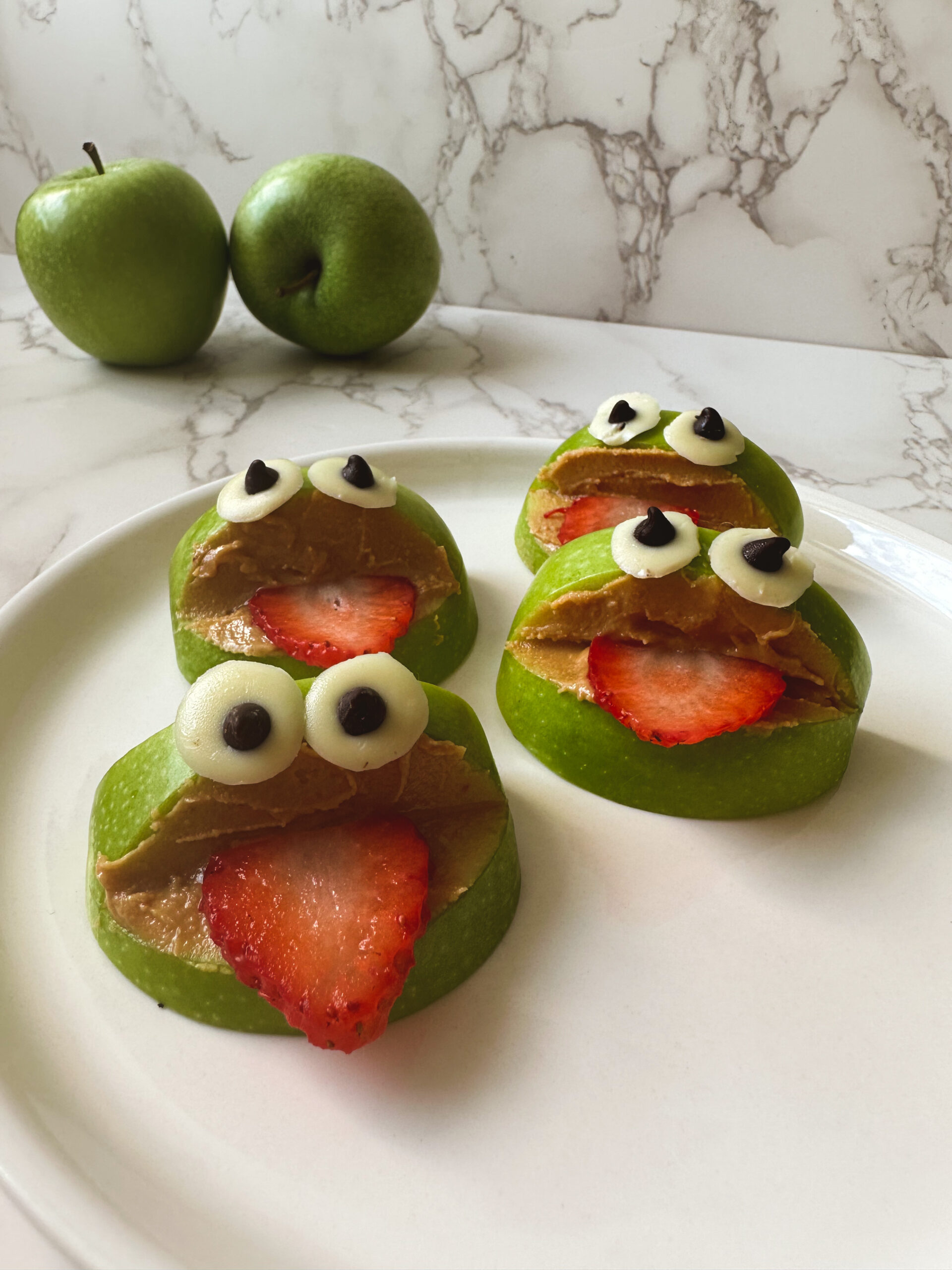 Finally, put 2 googly eyes on top of each monster - you can attach them with a little peanut butter and serve!