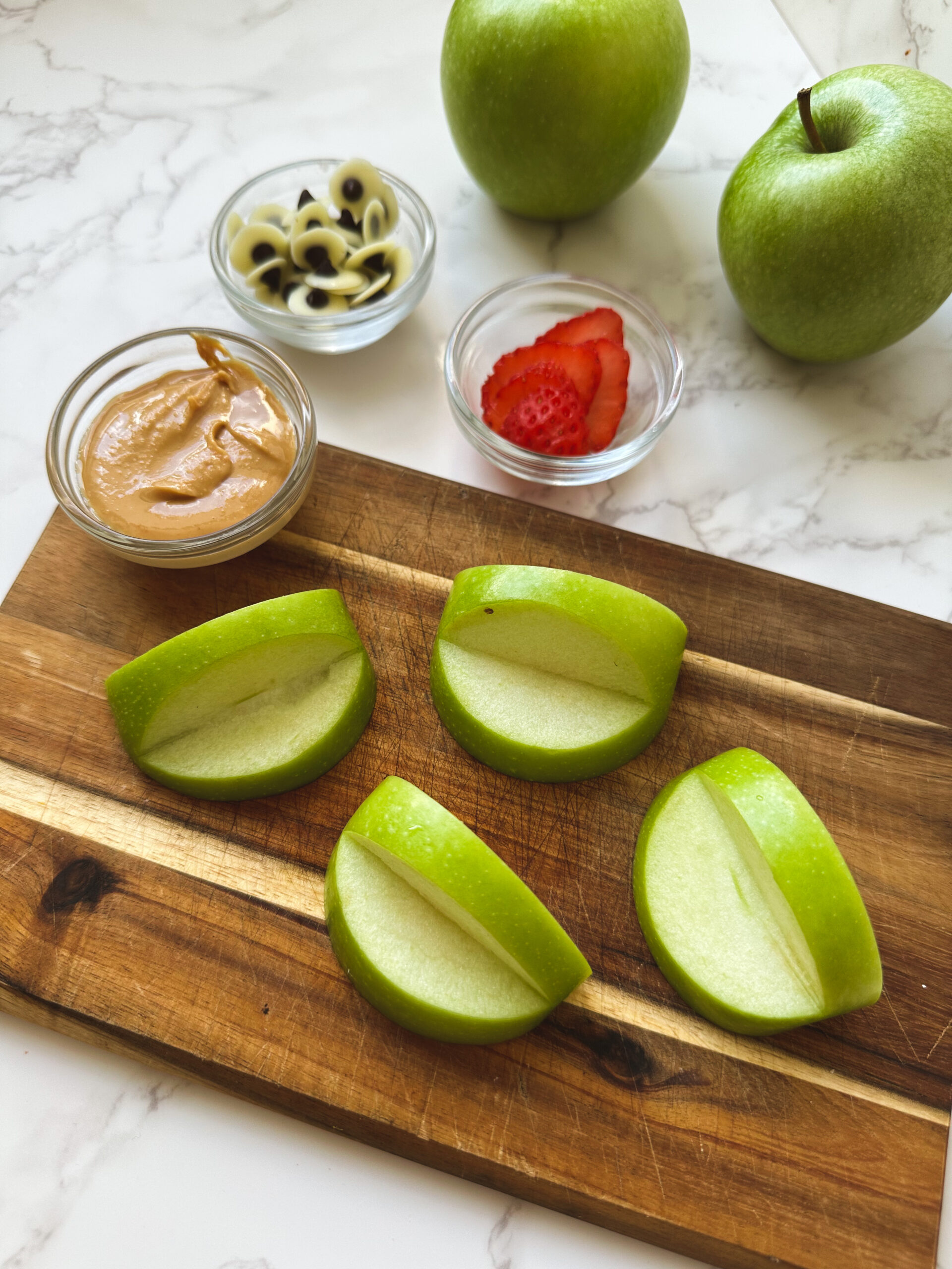 First, cut the apple into quarters. Lay the apple quarters down, and cut small wedge in the middle of the peel side of each quarter to create a mouth. Don't be a perfectionist, you'll be filling your mouth with peanut butter anyway, so if you cut into the apple a little wrong, it's no big deal and easily masked.