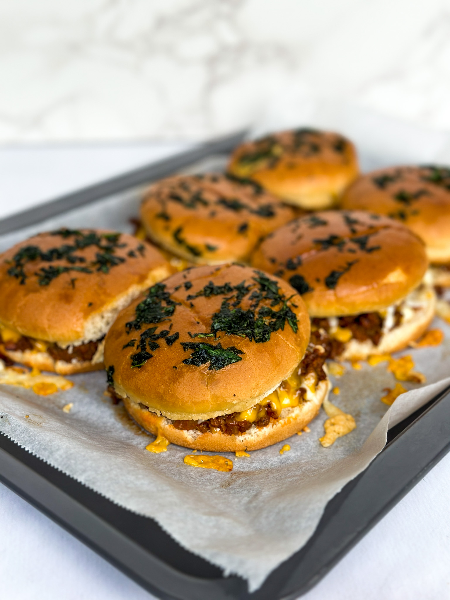 Melt a tablespoon of butter and stir in your favorite herbs. Lightly brush the tops of the burger buns with the herby butter. Bake the Sloppy Joes until the cheese melts and the buns turn golden. Enjoy!