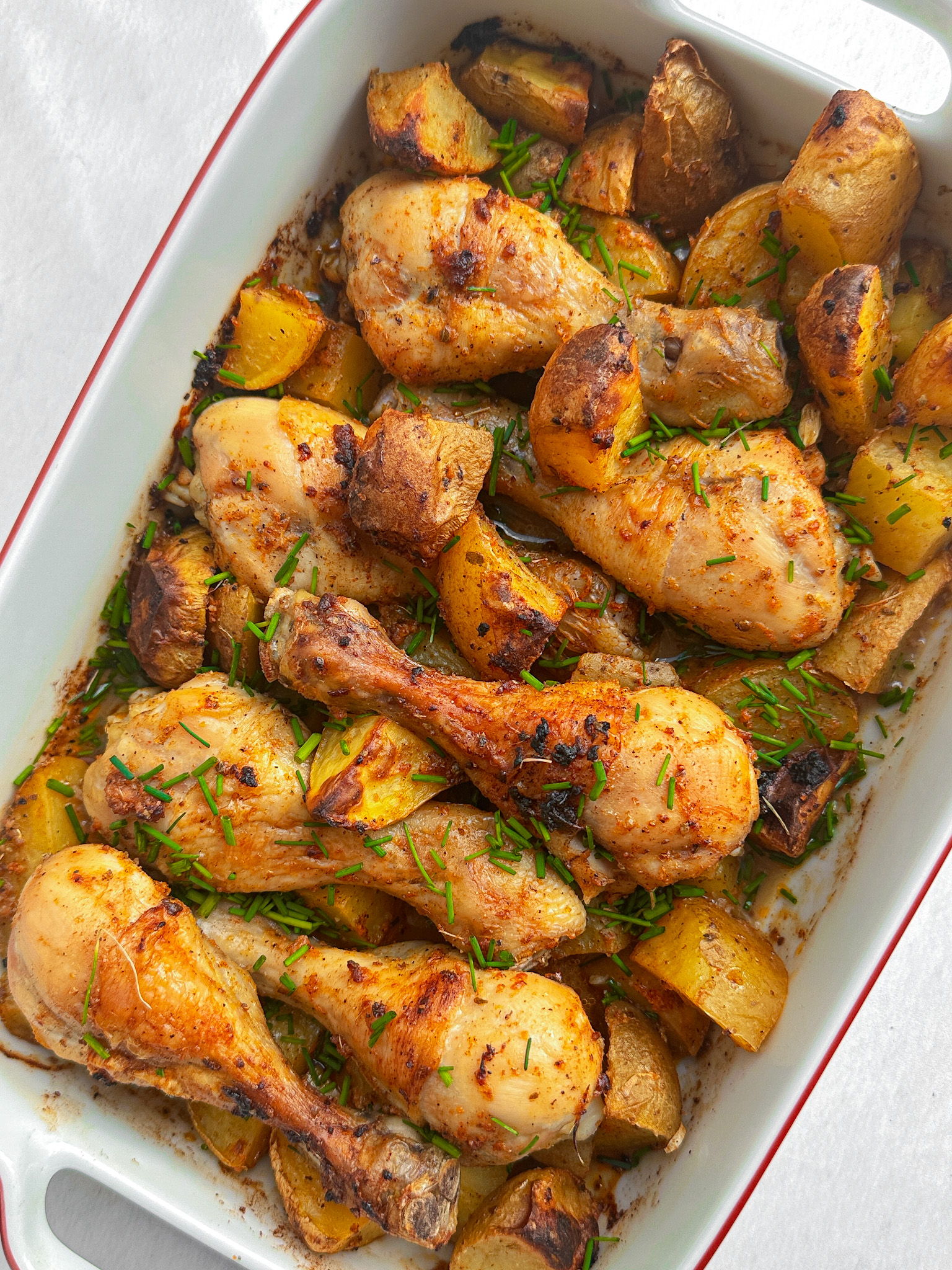 Transfer the baking dish to the preheated oven. Allow the chicken and potatoes to roast for about 60 minutes. Halfway through, give the contents a gentle stir to ensure even cooking and browning. Broil for last 5 minutes so the chicken gets golden brown and crispy.