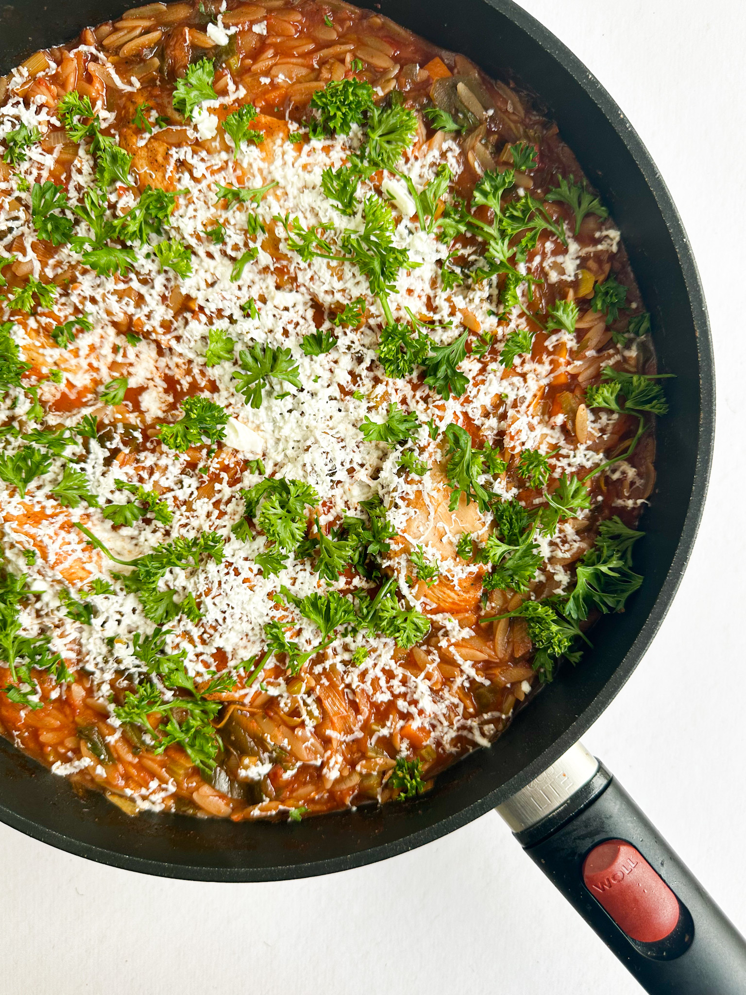 After cooking, adjust seasoning with additional salt and pepper if needed. Dish out into plates or bowls, ensuring each serving gets a piece of chicken and a generous scoop of orzo and sauce. Top with fresh parsley and crumbles of feta cheese. Enjoy!
