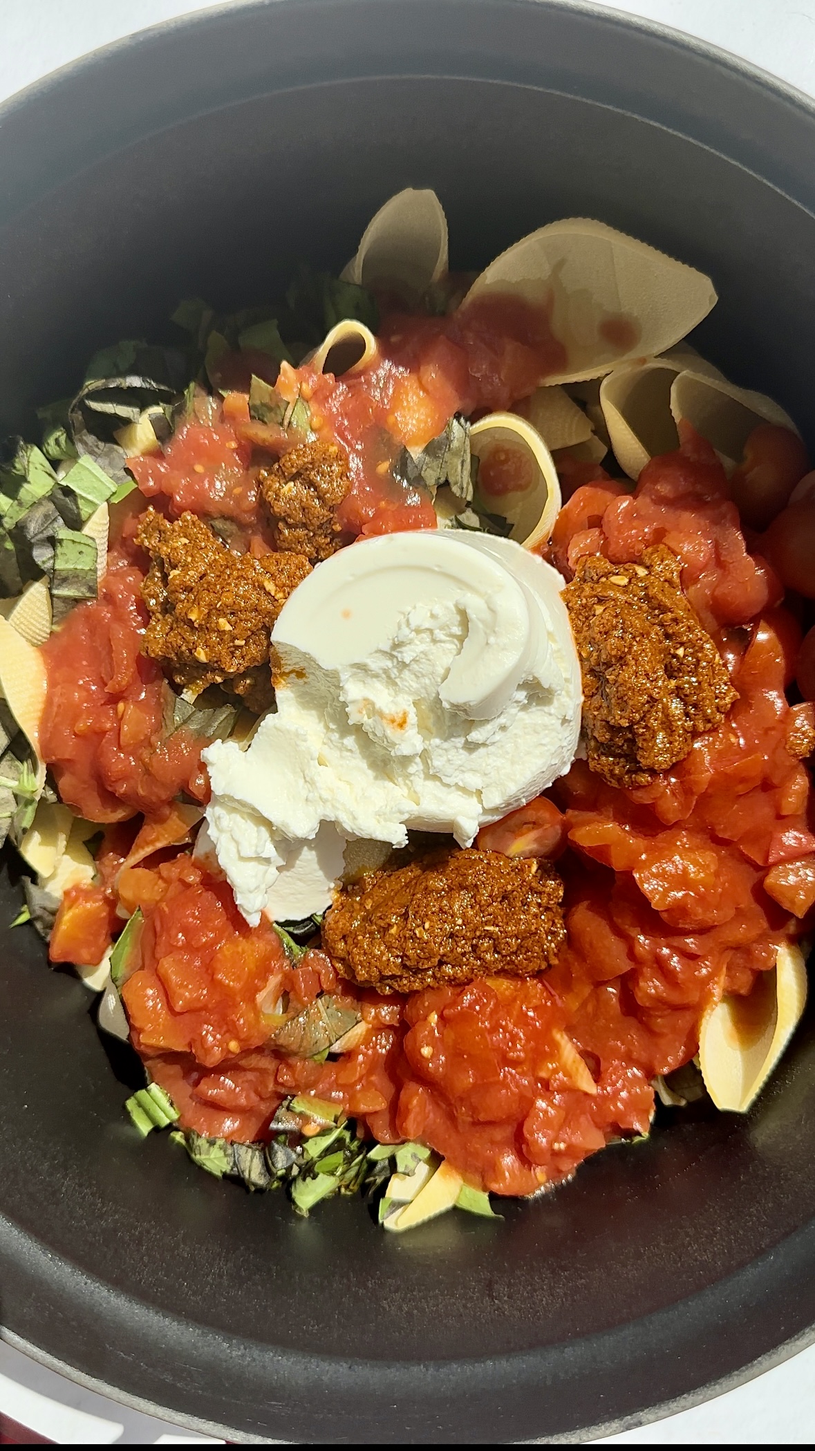In a large pot or pan, combine jumbo pasta shells, cherry tomatoes, canned chopped tomatoes, ricotta cheese, sun-dried tomato pesto, roughly torn basil (reserve a little for garnish), dried oregano, garlic powder, salt, and black pepper. Mix everything gently, ensuring that the ricotta cheese and pesto spread evenly among the shells.