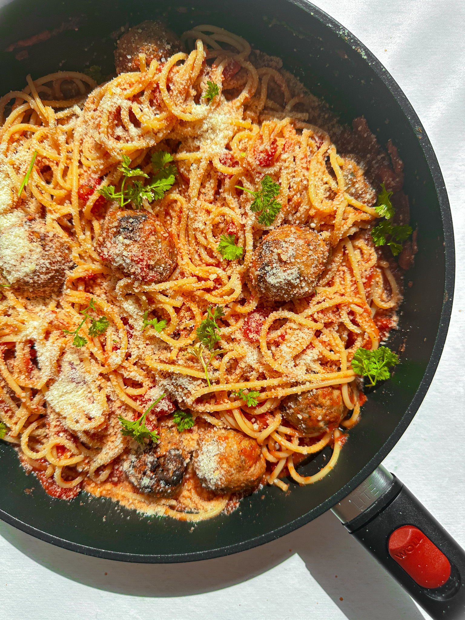 While the meatballs are baking, bring a large pot of salted water to a boil. Add the uncooked spaghetti and cook according to the package instructions, or until al dente. Drain the water and set the spaghetti aside.