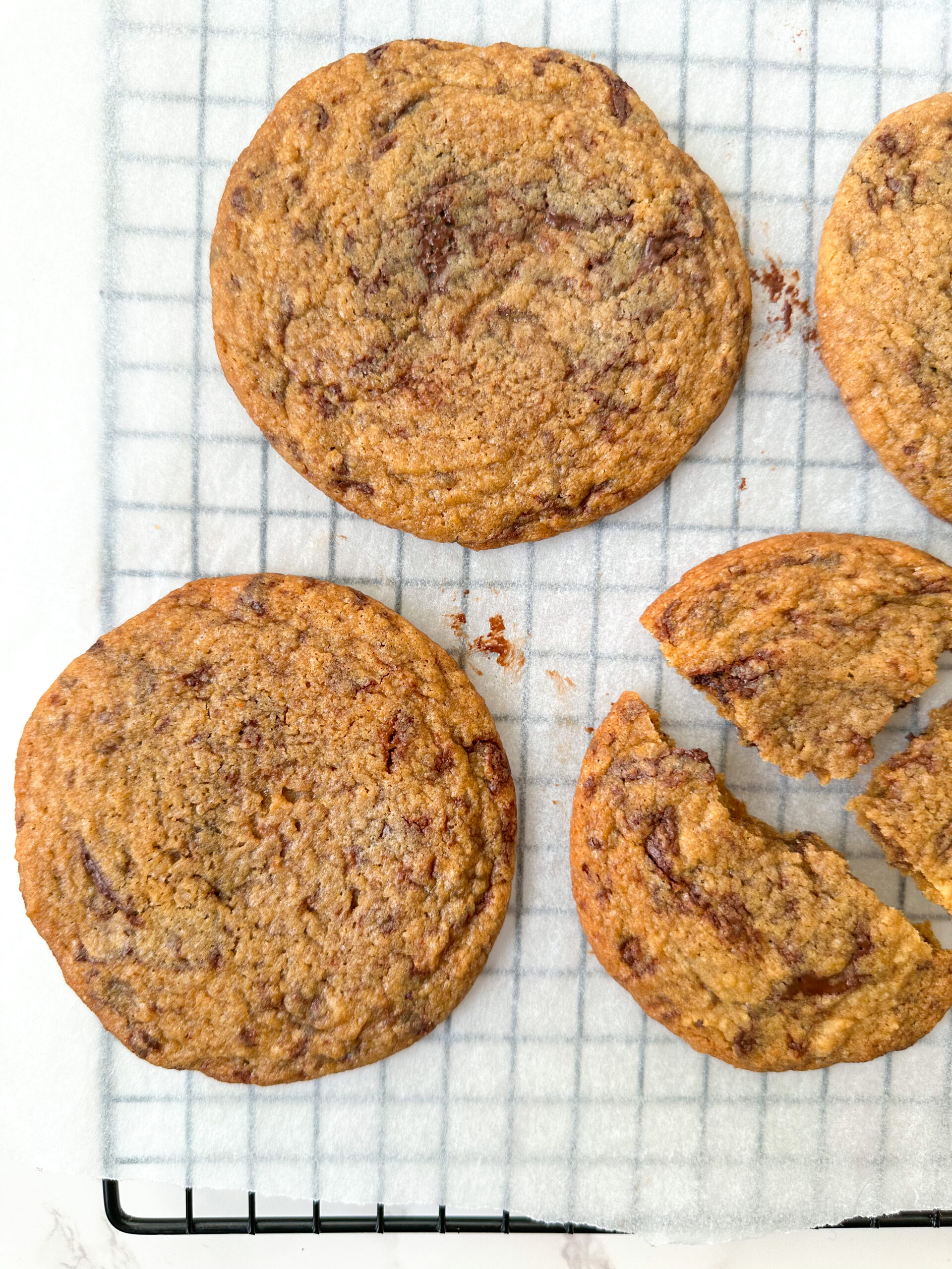 Scoop the dough into 12 equal balls and spread them out on a baking sheet lined with parchment paper. Leave enough spacing between each ball, the cookies are quite big, so don't let them run into each other. Bake for 10 minutes or until cookies are nicely spread and lightly golden. Once baked, transfer them immediately to a cooling rack, but work really carefully. The cookies are very fragile while still warm. Leave them on the rack until they're completely cool and then just enjoy!